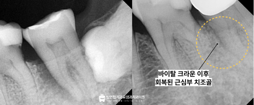 근심 부분의 파괴되었던 치조골이 회복 양상을 보였습니다.