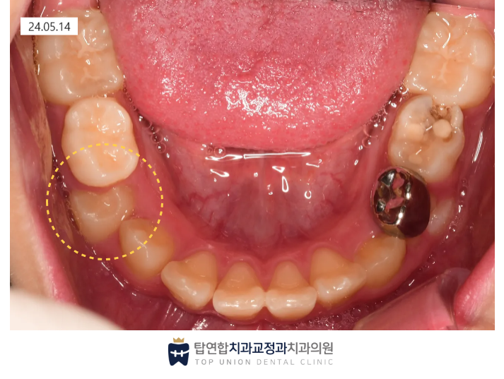 구강 내 검진을 해보니 아래쪽의 첫번째 작은 어금니가 비뚤어져서