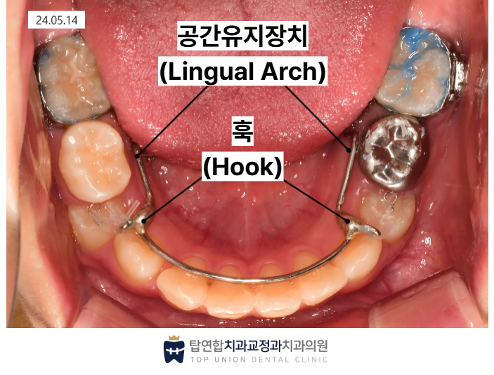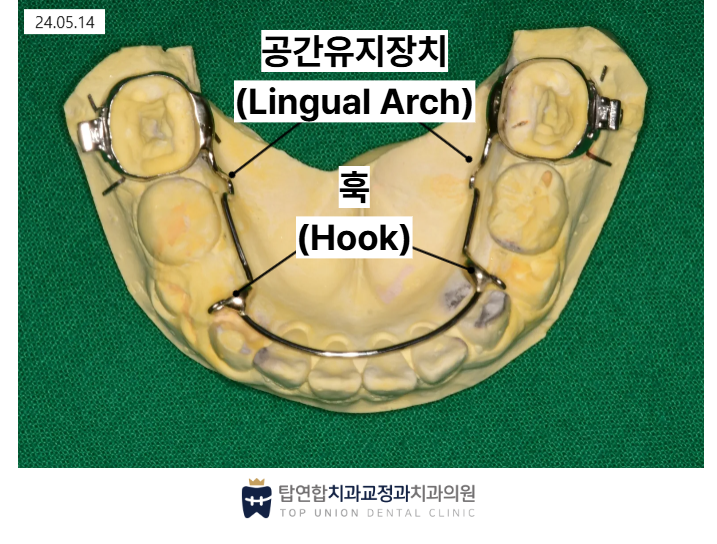계획한 치료에 맞는 공간유지장치+훅 장치를 제작하였습니다.