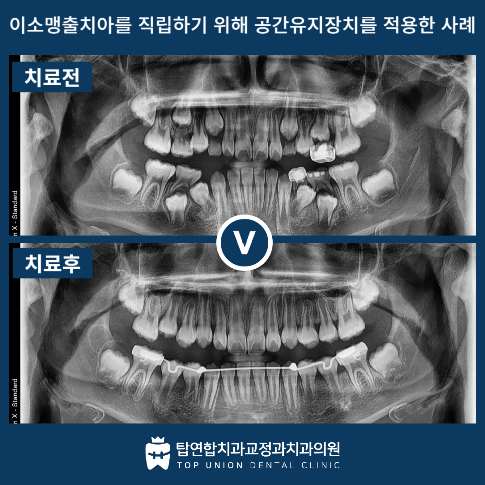 이소맹출치아를 직립하기 위해 공간 유지 장치를 적용한 사례